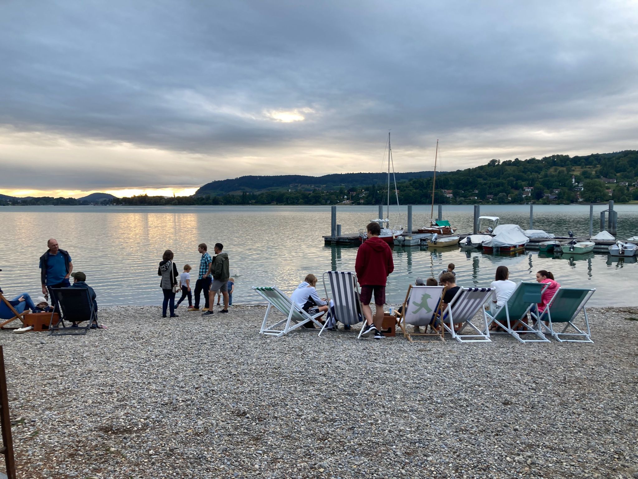 Obwohl es zwischendurch stark nach Regen aussah, haben wir in Mammern nur ein paar Tropfen gespürt. Unsere Gäste liessen sich davon gar nicht beirren und blieben auf Ihren Stühlen, Bänken oder Strandstühlen sitzen und genossen die Stimmung am See. Gegen 21.30 Uhr liess sich sogar kurz die Sonne blicken für den Sonnenuntergang, so dass wieder ein paar tolle Fotos entstanden sind.