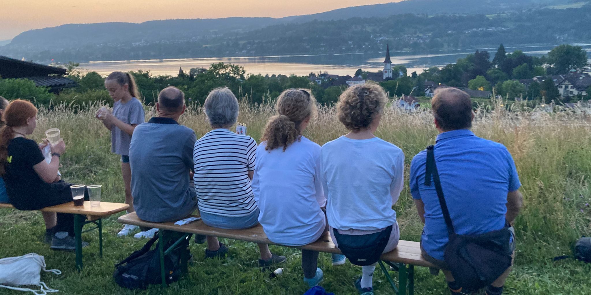 Beim Schützenhaus hatten unsere fleissigen Grilleure Martin und Karl bereits die leckeren Schnitzel für unsere Schnitzelbrote bereit. Die Teilnehmenden konnten hier auch mit einem kühlen Getränk ihren Durst löschen und dabei die Aussicht und den schönen Abend geniessen. Und natürlich gab es nach dem Hauptgang auch noch feine Kuchen zum Nachtisch. Die Stimmung unter den Teilnehmenden war ausgelassen und fröhlich.